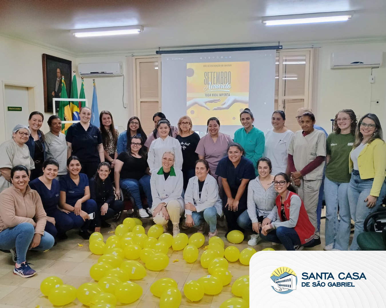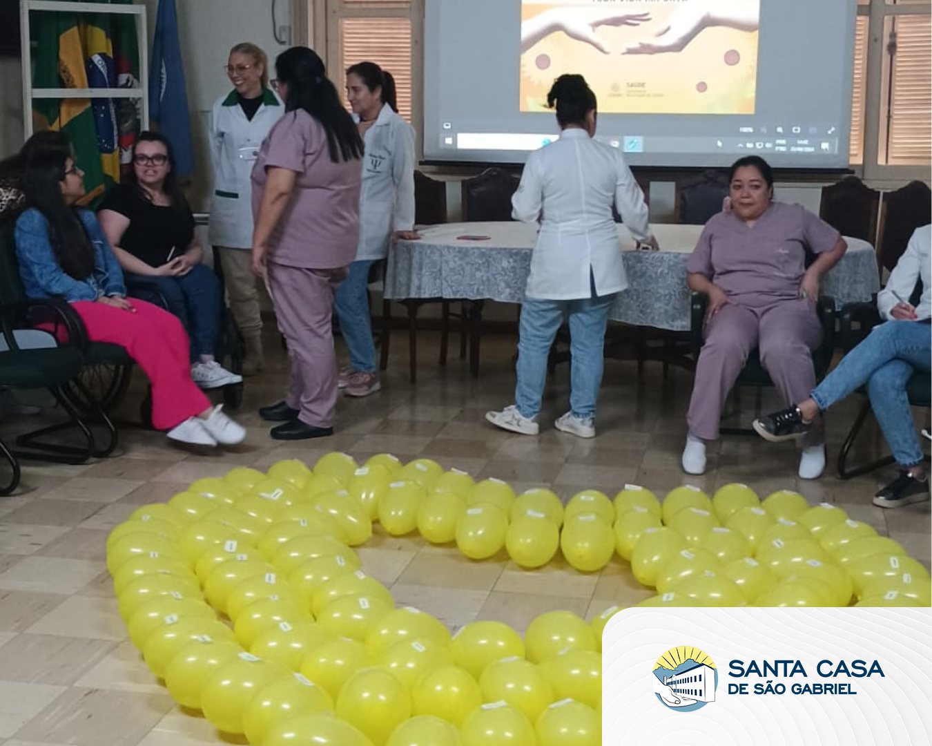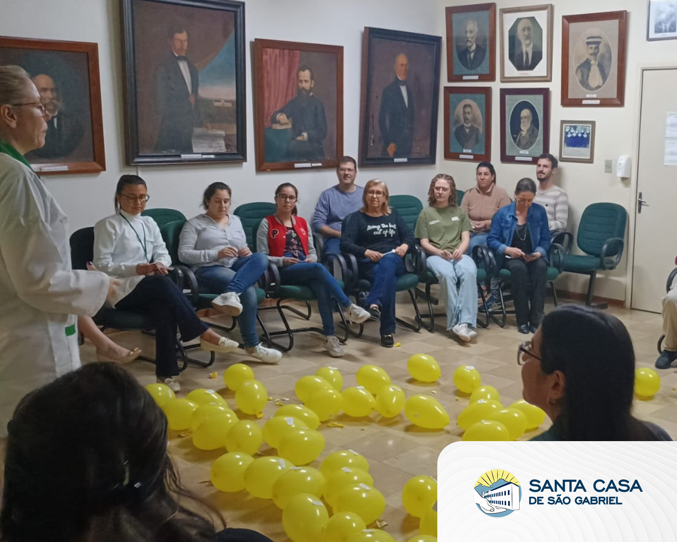 Ontem, 23/09, iniciamos a Semana Setembro Amarelo na Santa Casa com foco na saúde mental dos colaboradores! Pela manhã, tivemos ginástica laboral com a aluna Caroline Gomes da URCAMP nos setores administrativos. À tarde, contamos com uma dinâmica conduzida pelas estagiárias de Psicologia da URCAMP. Essas atividades visam promover o bem-estar no ambiente de trabalho e reforçar a importância do cuidado com a saúde mental.