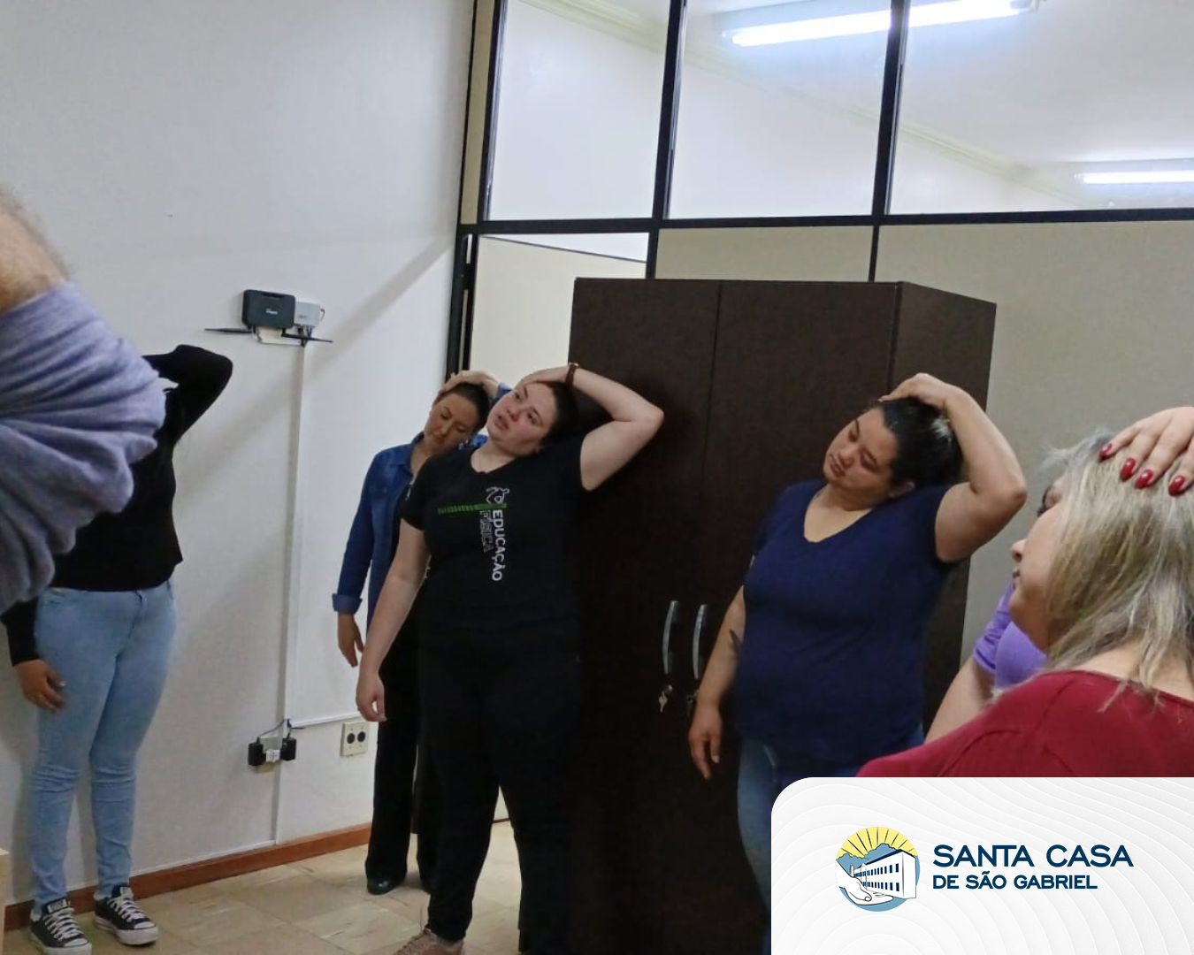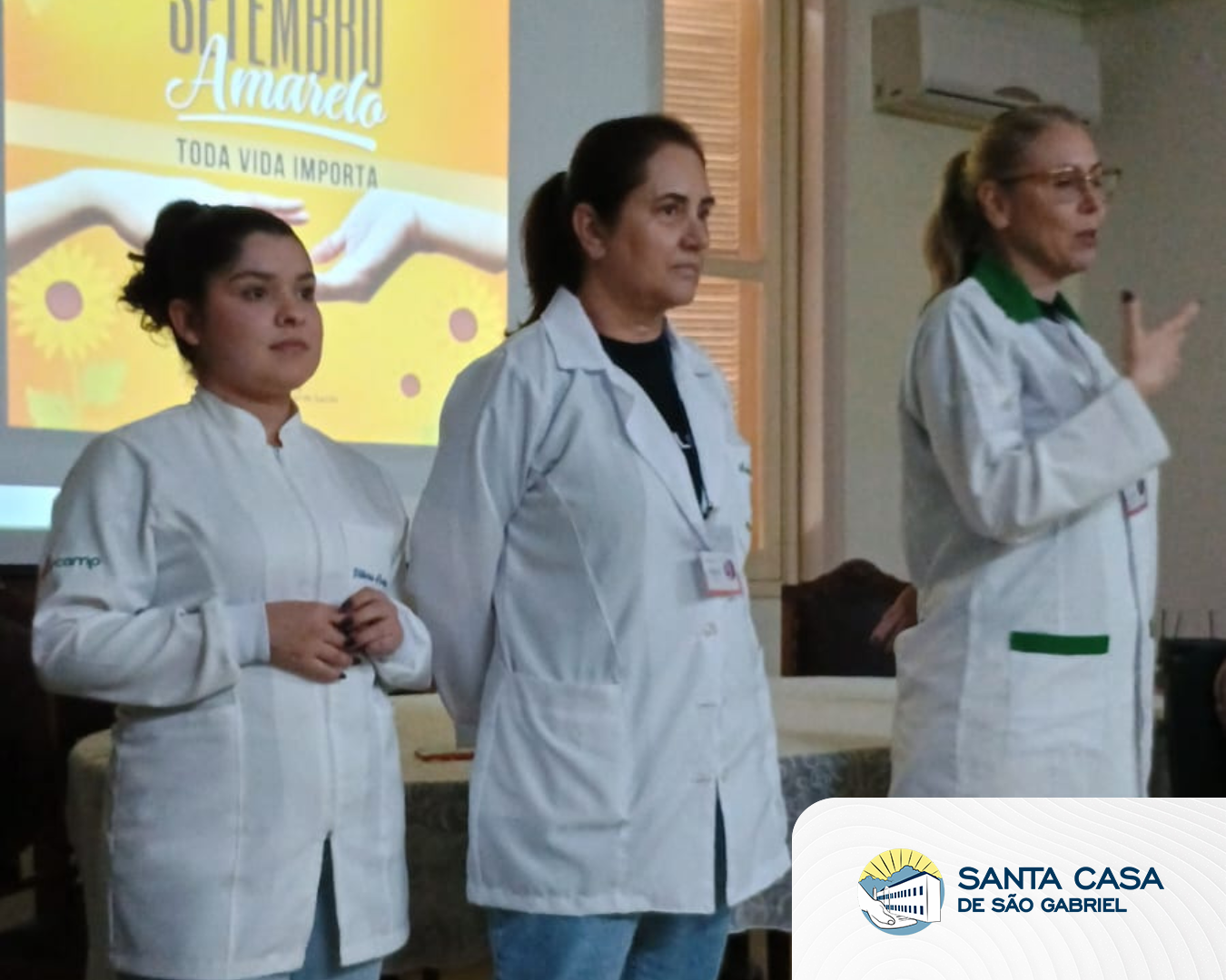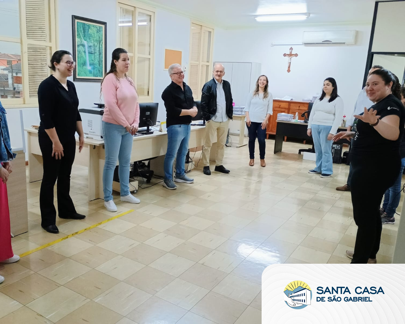 Ontem, 23/09, iniciamos a Semana Setembro Amarelo na Santa Casa com foco na saúde mental dos colaboradores! Pela manhã, tivemos ginástica laboral com a aluna Caroline Gomes da URCAMP nos setores administrativos. À tarde, contamos com uma dinâmica conduzida pelas estagiárias de Psicologia da URCAMP. Essas atividades visam promover o bem-estar no ambiente de trabalho e reforçar a importância do cuidado com a saúde mental.